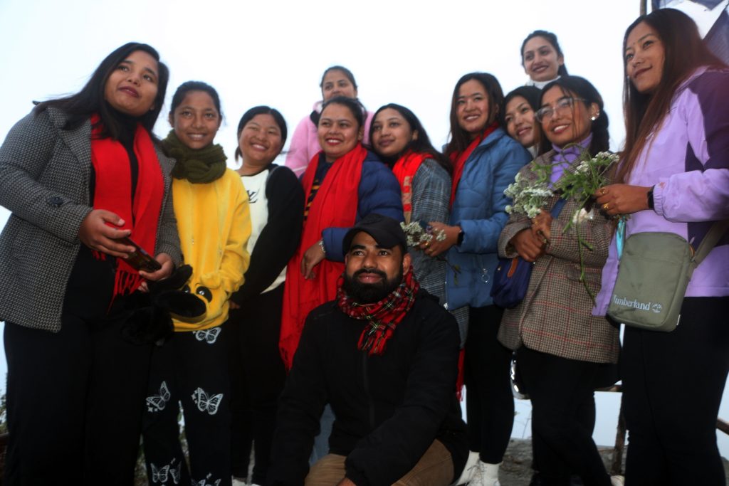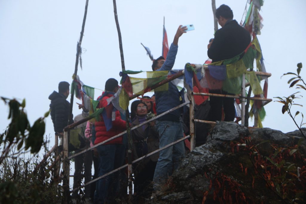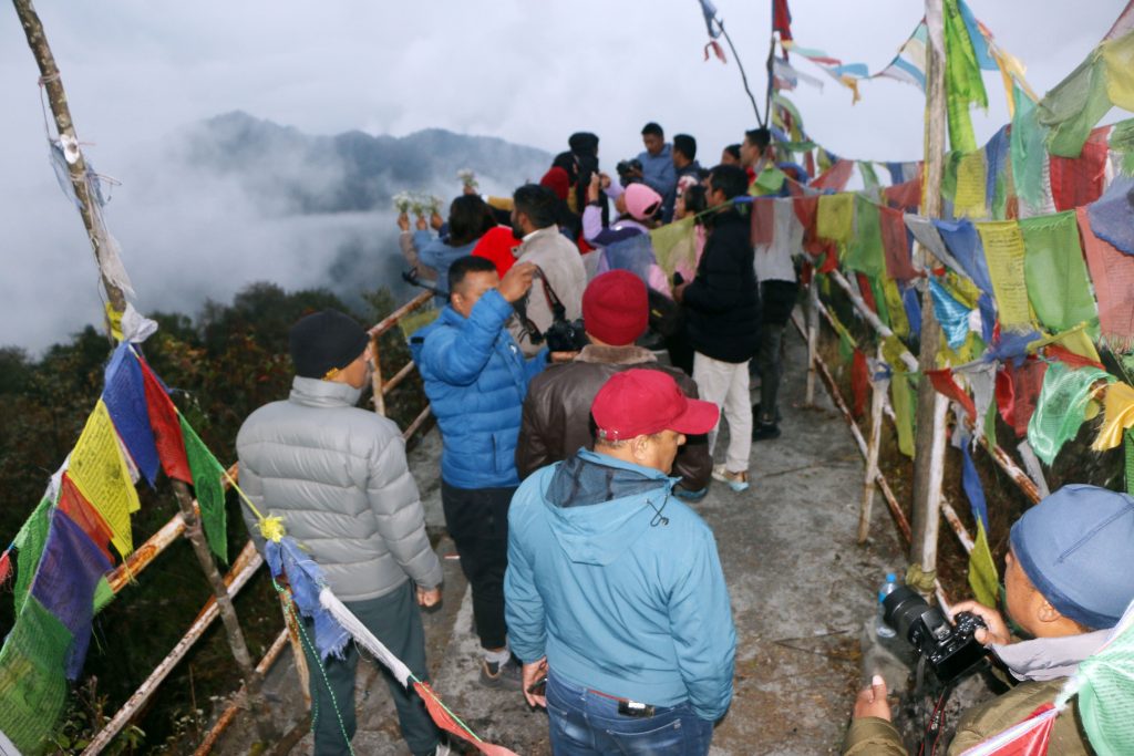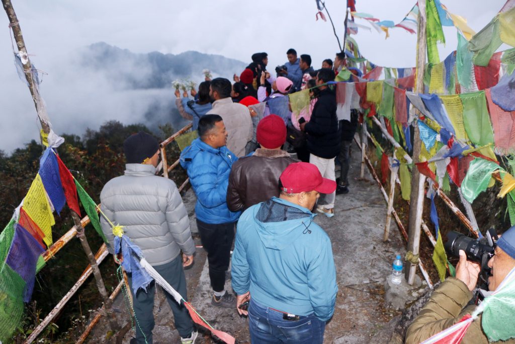 ताप्लेजुङको फुङ्लिङ नगरपालिका—९ स्थित झल्के डाँडामा बुधबार आन्तरिक पर्यटन प्रवर्दन गर्न पुगेका ताप्लेजुङ सञ्चारकर्मीहरु । झुलके डाँडाबाट सूर्याेदय दृश्य अवलोकन गर्न सकिन्छ । तर बुधबार भने मौसम प्रतिकुलका कारण सूर्याेदय अवलोकन हुन सकेन । तस्बिरः दिलकुमार