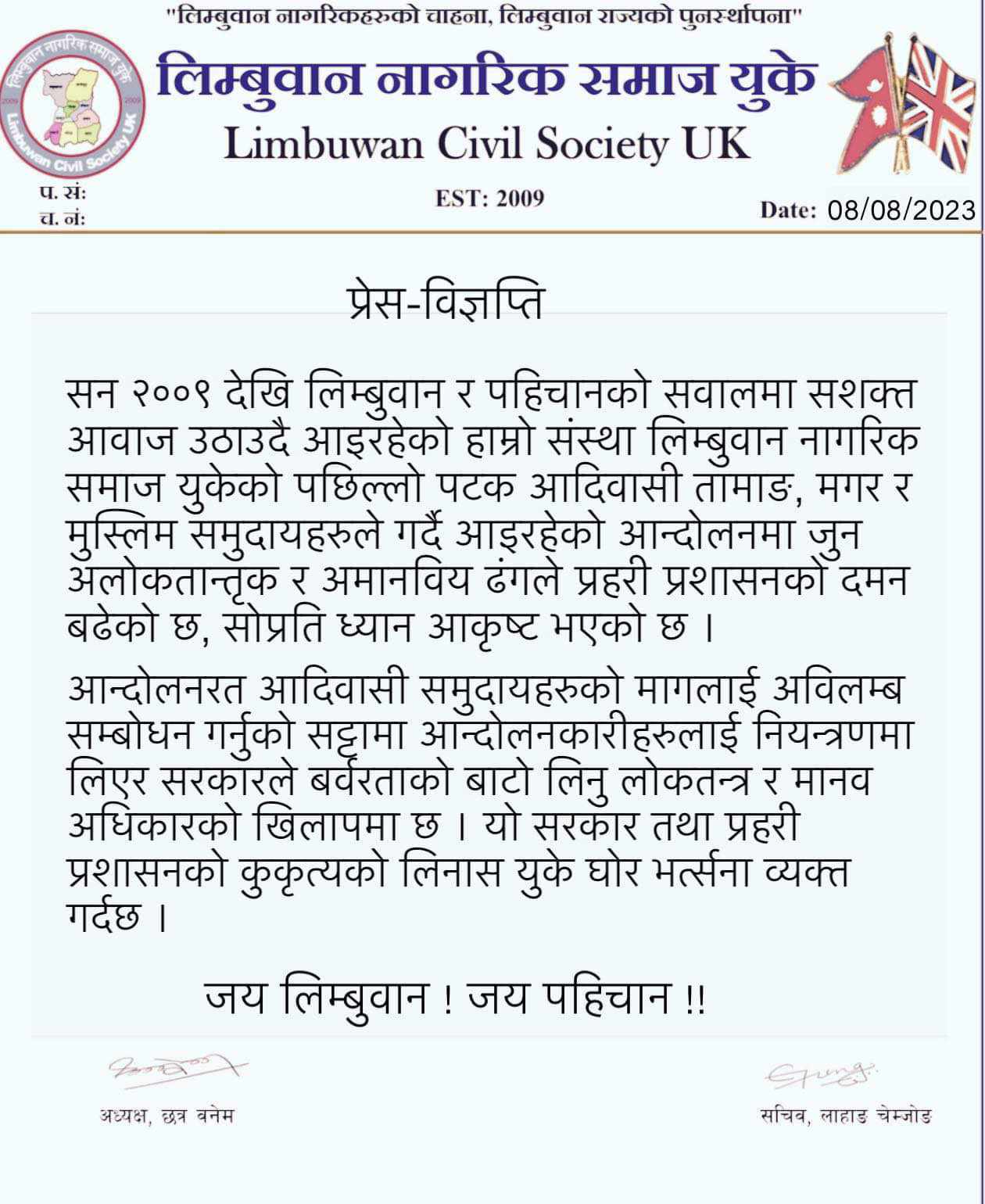 आदिवासीको माग सम्बोधन गर्न लिम्बुवान नागरिक समाज युकेद्धारा माग